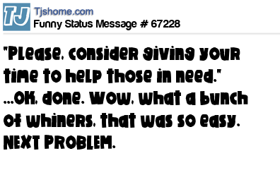 X "Please, consider giving your time to help those in need." ...Ok, done. Wow, what a bunch of whiners, that was so easy. NEXT PROBLEM.