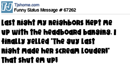 - # 90510 Last night my neighbors kept me up with the headboard banging. I finally yelled "The guy last night made her scream louder" That shut em upĀ