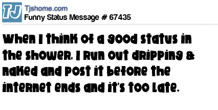 - # 89727 When I think of a good status update in the shower, I run out dripping & naked and post it before the internet ends and it's too late.