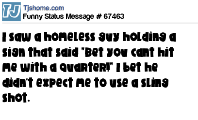 X says I saw a homeless guy holding a sign that said "Bet you cant hit me with a quarter!" I bet he didn't expect me to use a sling shot.