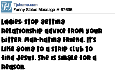 X says Ladies: stop getting relationship advice from your bitter, man-hating friend. It's like going to a strip club to find Jesus. She is single for a reason.