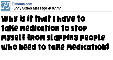 - # 100213 SO! My Dr tells me I have to take medication. Why? To stop you from slapping people who should be on medication. Hmmmm!