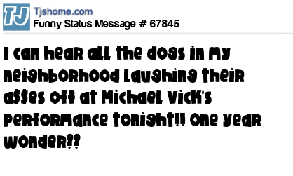 X is I can hear all the dogs in my neighborhood laughing their a$$es off at Michael Vick's performance tonight!! One year wonder??