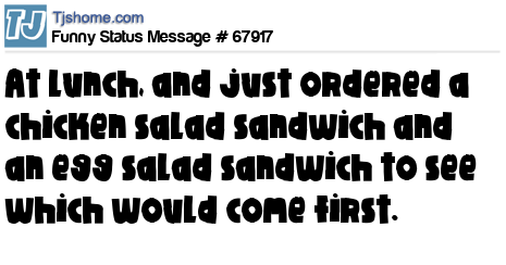 X At lunch, and just ordered a chicken salad sandwich and an egg salad sandwich to see which would come first.