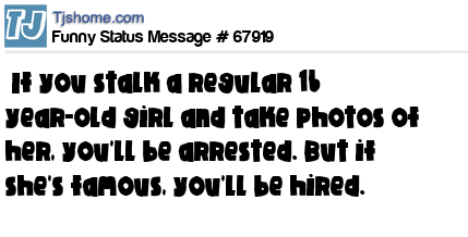 - # 68071 If you stalk a regular 16 year-old girl and take photos of her, you'll be arrested. But if she's famous, you'll be hired as a Paparazzi.