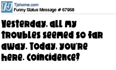 - # 145327 Yesterday, all my troubles seemed so far away, but now my boss is coming back from Costa Rica a day early.