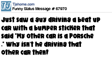 X says Just saw a guy driving a beat up car with a bumper sticker that said "My other car is a Porsche ." Why isn't he driving that other car then?