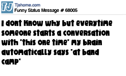 - # 38966 it just me or everytime someone says "and one time" you are thinking "at band camp" in the back of your head...