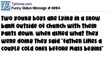 X two young boys are lying in a snow bank outside of church with their pants down. when asked what they were doing they said "father likes a couple cold ones before mass begins"