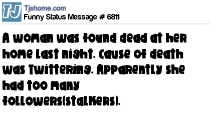X says a woman was found dead at her home last night. Cause of death was Twittering. Apparently she had too many followers(stalkers).