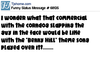 X is I wonder what that commercial with the corndog slapping the guy in the face would be like with the "Benny Hill" theme song played over it?.........