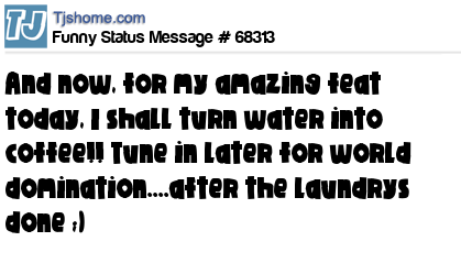 X is And now, for my amazing feat today, I shall turn water into coffee!! Tune in later for world domination....after the laundrys done ;)