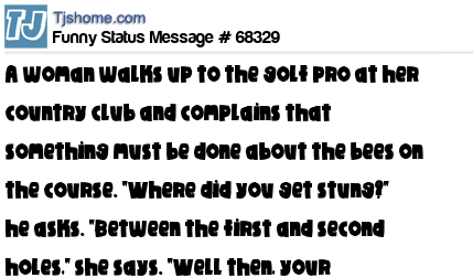 X A woman walks up to the golf pro at her country club and complains that something must be done about the bees on the course. "Where did you get stung?" he asks. "Between the first and second holes," she says. "Well then, your stance is too wide."