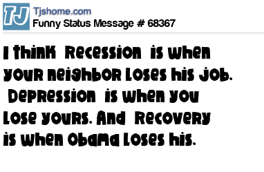 - # 56011 Recession is when your neighbor loses his job. Depression is when you lose your job. Recovery is when Obama loses his job