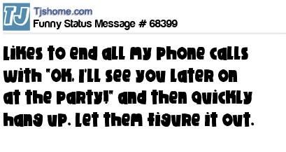 - # 65174 I like to end all my phone calls with "Ok, I'll see you later on at the party!" and then quickly hang up.. Baffle 'em with BS!! ;-)