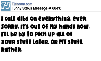 X I call dibs on everything, ever. Sorry, it's out of my hands now. I'll be by to pick up all of your stuff later. Or MY stuff, rather.