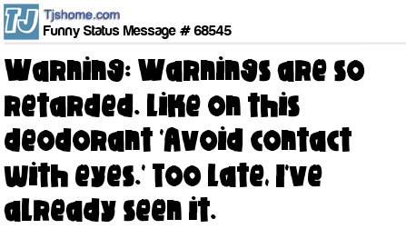 - # 104288 Some Warning Labels are a little retarded, like on my Deodorant it says, "Avoid Contact with Eyes"....TOO LATE, I've already seen it!!!
