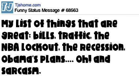 X My list of things that are great: bills, traffic, the NBA lockout, the recession, Obama's plans.... Oh! and sarcasm.