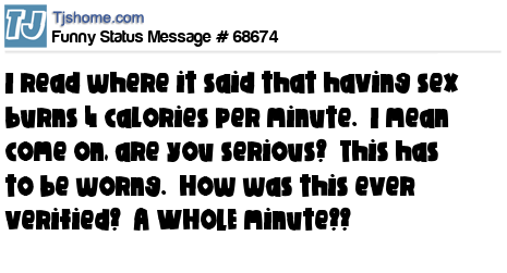 X I read where it said that having sex burns 4 calories per minute. I mean come on, are you serious? This has to be worng. How was this ever verified? A WHOLE minute??