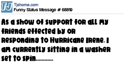 X As a show of support for all my friends effected by or responding to Hurricane Irene, I am currently sitting in a washer set to spin............