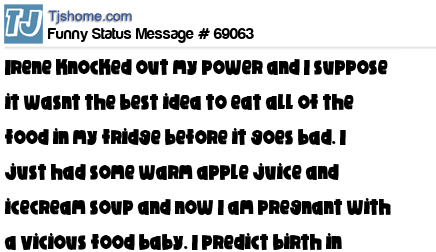 X is Irene knocked out my power and I suppose it wasnt the best idea to eat all of the food in my fridge before it goes bad. I just had some warm apple juice and icecream soup and now I am pregnant with a vicious food baby. I predict birth in about 20mins.