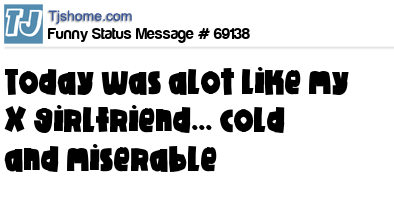 - # 178027 Girlfriend: Mick, I'm miserable in our relationship. Me: FOR REAL? Girlfriend: Yes. I can't sleep. I can't eat. I've lost 10 lbs. Me: So you're saying it's over? Girlfriend: Well, not yet. I wanna lose 15.