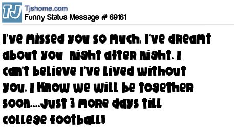 X I've missed you so much, I've dreamt about you night after night. I can't believe I've lived without you, I know we will be together soon....Just 3 more days till college football!