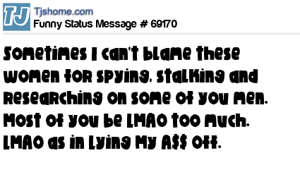 X is Sometimes I can't blame these women for spying, stalking and researching on some of you men. Most of you be LMAO too much. LMAO as in Lying My A$$ Off.