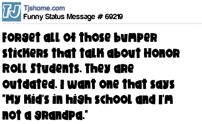 X Forget all of those bumper stickers that talk about Honor Roll Students. They are outdated. I want one that says "My kid's in high school and I'm not a grandpa."