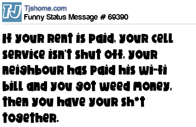 X says If your rent is paid, your cell service isn't shut off, your neighbour has paid his wi-fi bill and you got weed money, then you have your sh*t together.