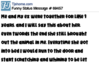 X Me and my ex were together for like 9 years, and I will say this about her, even twords the end she still brought out the animal in me. Everytime she got into bed I would run to the door and start scratching and whining to be let out. :P