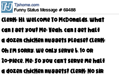 X Clerk: Hi, welcome To McDonalds, what can I get you? Me: Yeah, can I get half a dozen chicken nuggets please? Clerk: Oh I'm sorry, we only serve 6, 10 or 20-piece. Me: So you can't serve me half a dozen chicken nuggets? Clerk: No sir Me: OK, interesting.