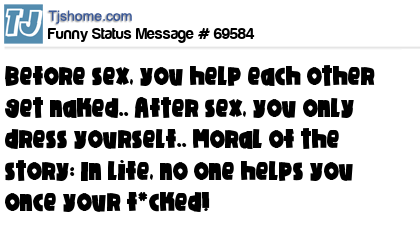 - # 43697 Before sex, you help each other get naked. After sex, you only dress yourself. Moral of the story: in life no one helps you once you're f*cked.