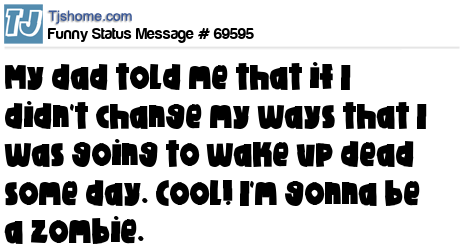 X My dad told me that if I didn't change my ways that I was going to wake up dead some day. Cool! I'm gonna be a zombie.