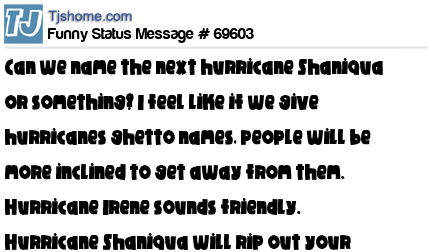X is Can we name the next hurricane Shaniqua or something? I feel like if we give hurricanes ghetto names, people will be more inclined to get away from them. Hurricane Irene sounds friendly. Hurricane Shaniqua will rip out your weave if you look at it wrong.