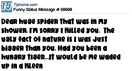 X says Dear huge spider that was in my shower, I'm sorry I killed you. The ugly fact of nature is I was just bigger than you. Had you been a hungry tiger...It would be me waded up in a kleen