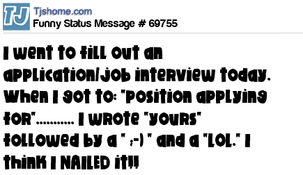 X I went to fill out an application/job interview today. When I got to: "position applying for"........... I wrote "yours" followed by a " ;-) " and a "LOL." I think I NAILED it!!