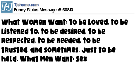X What Women Want: To be loved, to be listened to, to be desired, to be respected, to be needed, to be trusted, and sometimes, just to be held. What Men Want: Sex