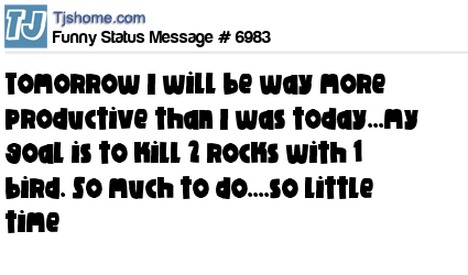 X is Tomorrow I will be way more productive than I was today...my goal is to kill 2 rocks with 1 bird. So much to do....so little time