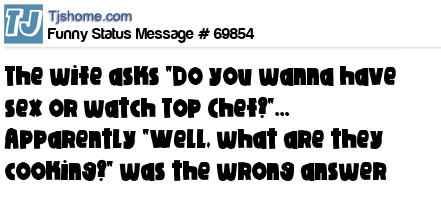X is The wife asks "Do you wanna have sex or watch Top Chef?"... Apparently "Well, what are they cooking?" was the wrong answer