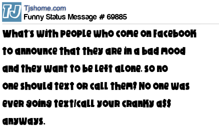 X says What's with people who come on Facebook to announce that they are in a bad mood and they want to be left alone, so no one should text or call them? No one was ever going text/call your cranky a$$ anyways.