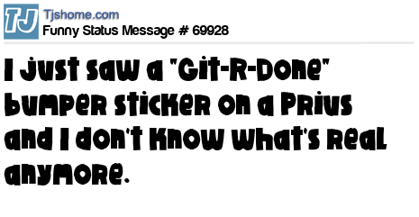 X I just saw a "Git-R-Done" bumper sticker on a Prius and I don't know what's real anymore.