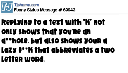 X is Replying to a text with "k" not only shows that you're an a**hole, but also shows your a lazy f**k that abbreviates a two letter word.