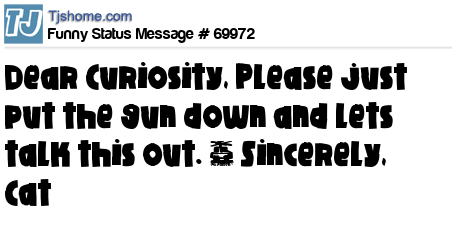 - # 37716 Dear Curiosity, just put the gun down and lets talk this out.~ Sincerely, The Cat.