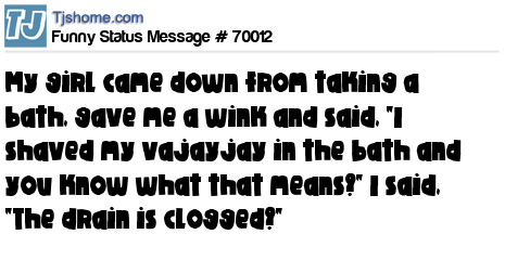 X My girl came down from taking a bath, gave me a wink and said, "I shaved my vajayjay in the bath and you know what that means?" I said, "The drain is clogged?"
