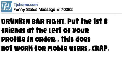 X DRUNKEN BAR FIGHT. Put the 1st 8 friends at the left of your profile in order... this does not work for moble users...CRAP.