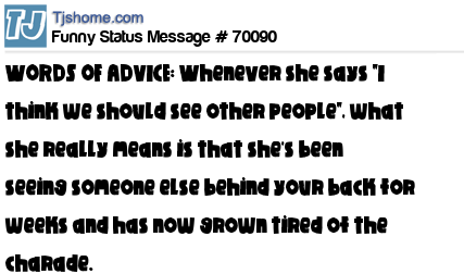 X says WORDS OF ADVICE: Whenever she says "I think we should see other people", what she really means is that she's been seeing someone else behind your back for weeks and has now grown tired of the charade.