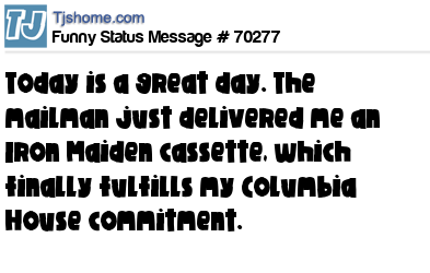 - # 196682 Yesterday was a great day. The mailman delivered to me a Three Dog Night cassette, which finally fulfills my Columbia House commitment.