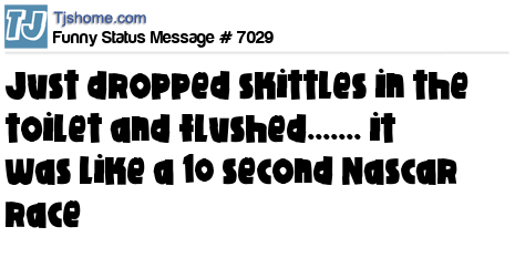 - # 74455 ...I just dropped a handful of skittles in the toilet and flushed..... it was like watching a Nascar race @ Bristol