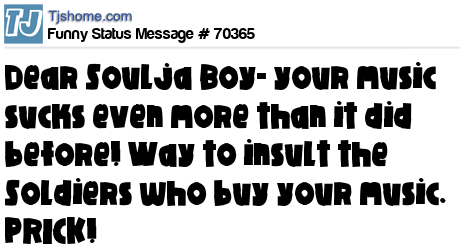 X says Dear Soulja Boy- your music sucks even more than it did before! Way to insult the Soldiers who buy your music. PRICK!